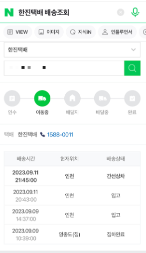 네이버에서 "한진택배 배송조회"를 검색하고, 송장번호를 입력하면 아래와 같이 배송정보를 확인할 수 있습니다.