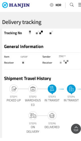 4-1. 상단의 파란 화면 : 현재 배송을 담당하는 회사는 "한진"이며, 송장번호는 "추적 번호"로 표시되어 있습니다.